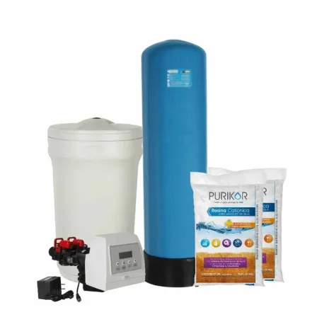 | Incluye | Una válvula de regeneración por demanda con perilla mecánica (27 GPM máx), un tanque para salmuera (100 litros), un tanque de fibra de vidrio 12"x48" (2 pies cúbicos), dos bultos de resina catiónica en presentación 26.5 litros (22 kg). |